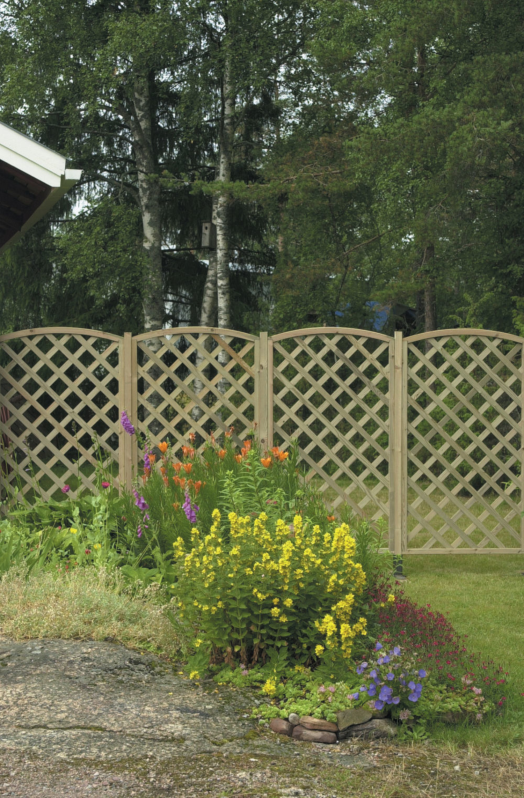 Sateenkaari-aita on vinoristikollinen aitaelementti, joka soveltuu paitsi itsenäiseksi aidaksi, myös koristeeksi umpiaitojen väliin tai osaksi pergolaa.
