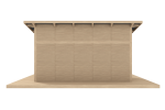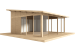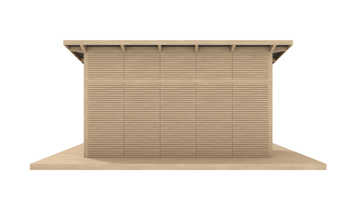 Pakettiin sisältyy ovipari kiskoineen sekä katon vanerit. Katon pintamateriaalit, lattia (terassi) ja koristeaidat myydään erikseen. Rakennuksen ulkomitta 510 x 510 cm (26,01m²), Katonala 34m². Koristeaita T87r ruskea.