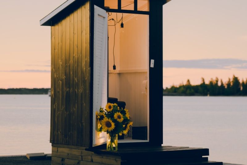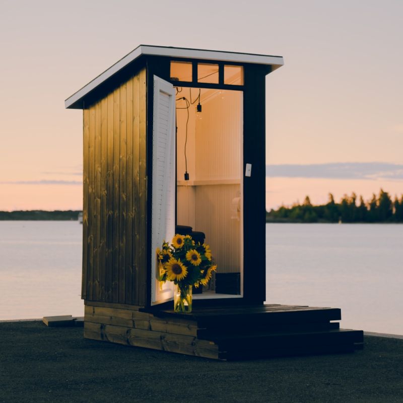 Lisävarusteena puuceen korokepala portain 30x240/110x138cm T451 ja katepaketti musta palahuopa sekä tippapellit katon kaikille reunoille T748.