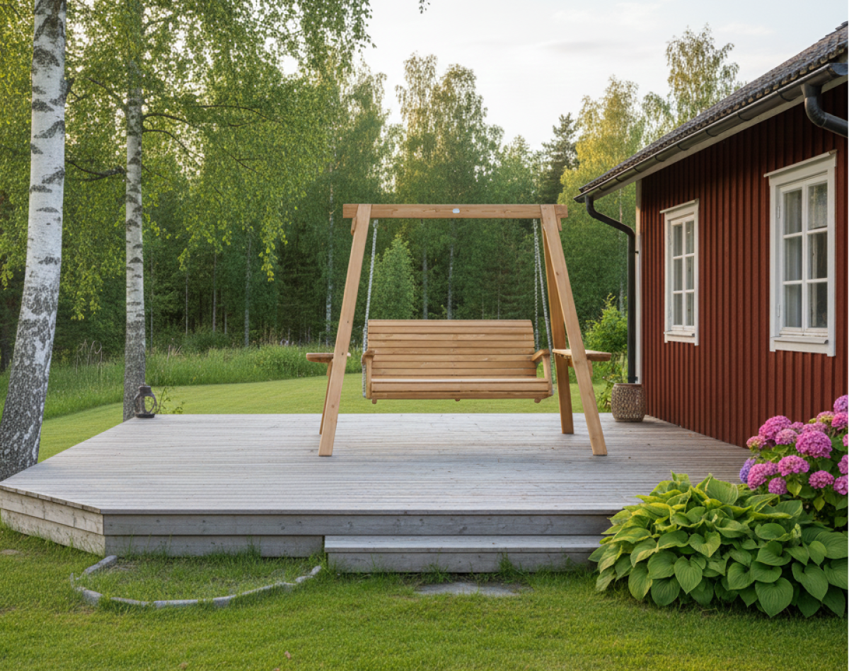Tukeva malli, istuinkorkeus säädettävissä ketjujen avulla. Suositellaan myös julkitilakäyttöön. Keinuun saatavana kangaskatto, ei pehmusteita.