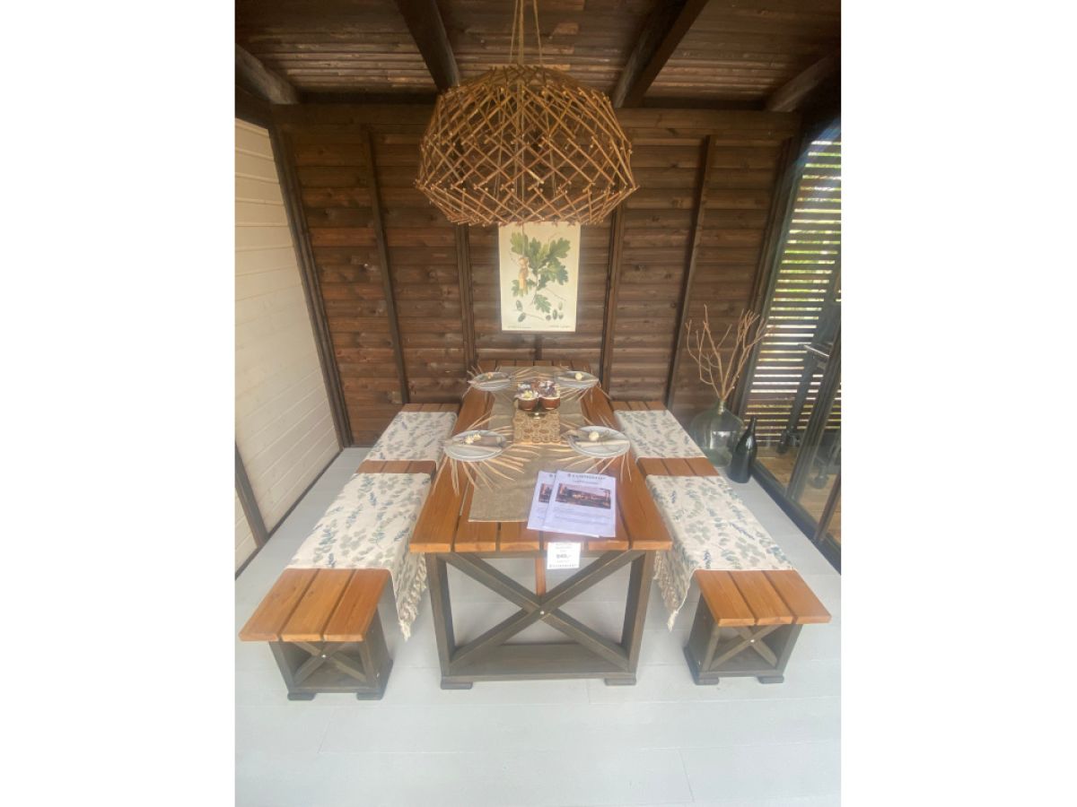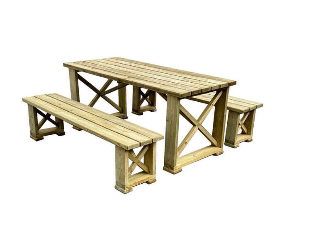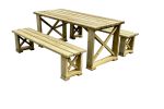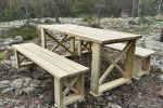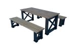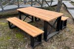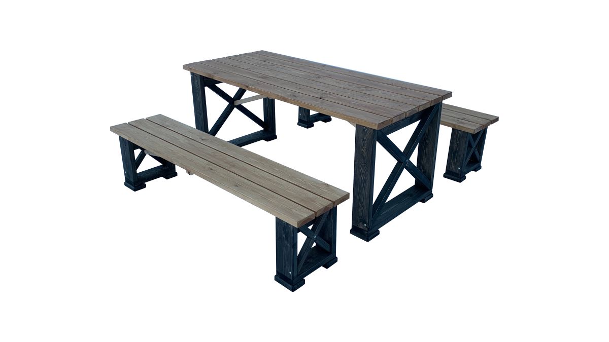 Runko kuultovärjätty musta ja kannet kuultovärjätty tatti. Materiaali höylättyä mäntyä. Suosittu ja tukeva pihakaluste tai vaikka sisäkäyttöön. Kalusteryhmä sisältää kaksi 170 cm:n pituista, penkkiä ja pöydän.
