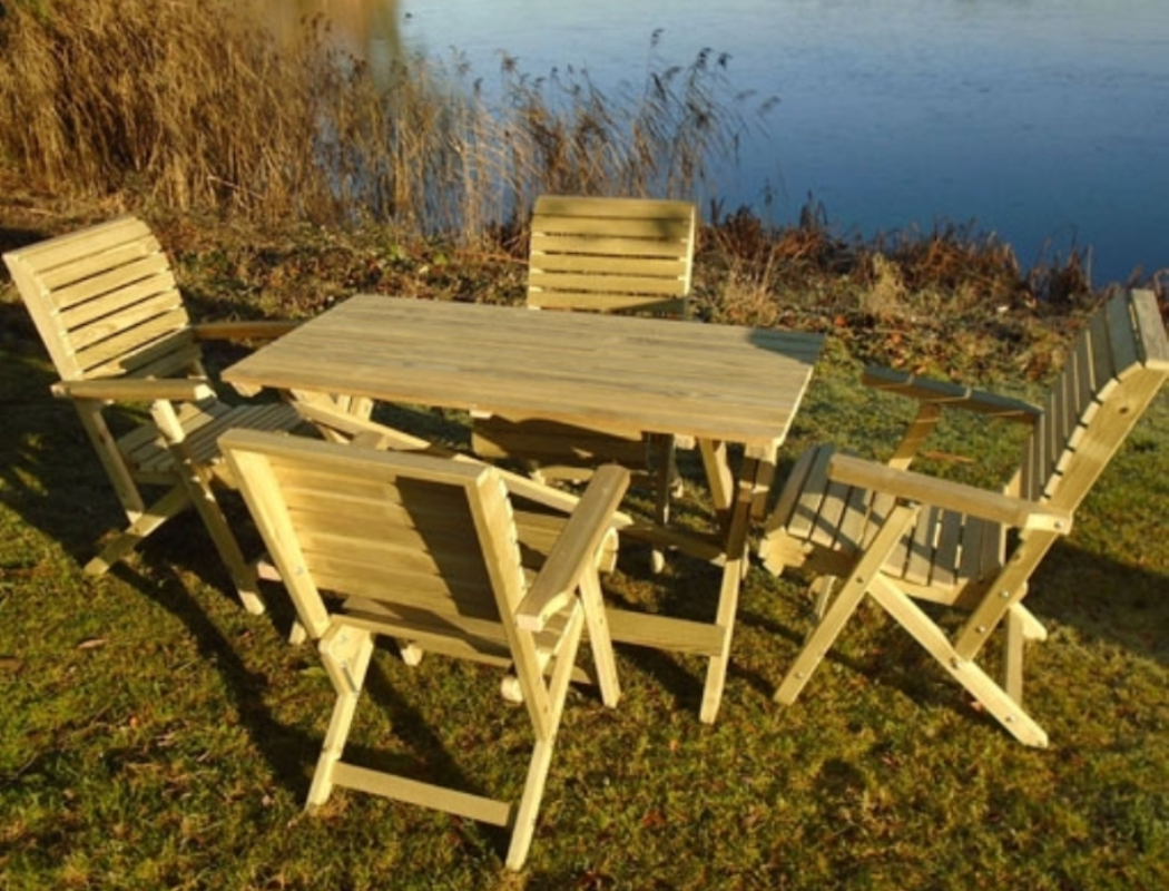 Taittuva malli, toimitetaan valmiiksi koottuna. Ryhmä sisältää neljä penkkiä ja pöydän.