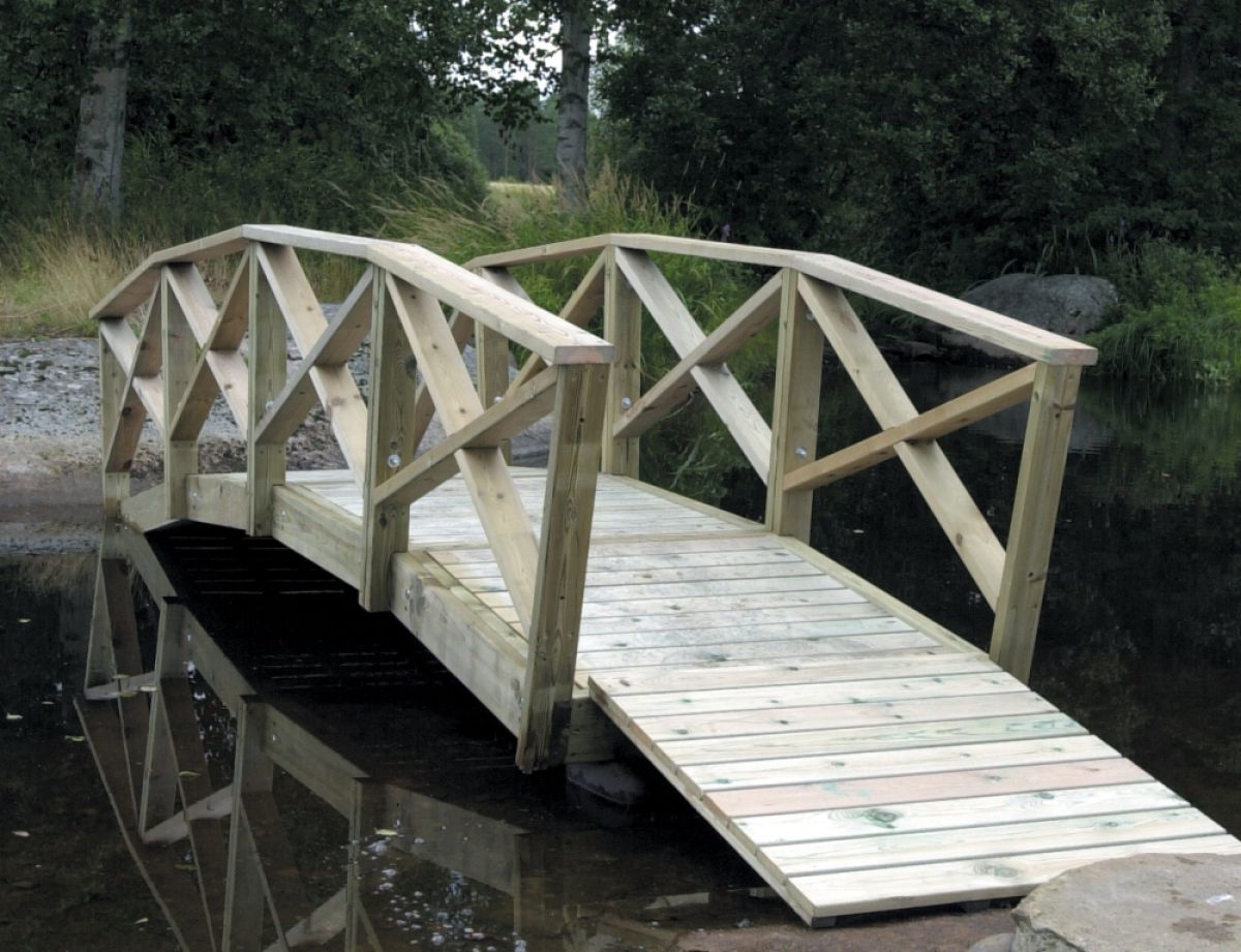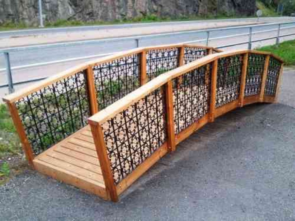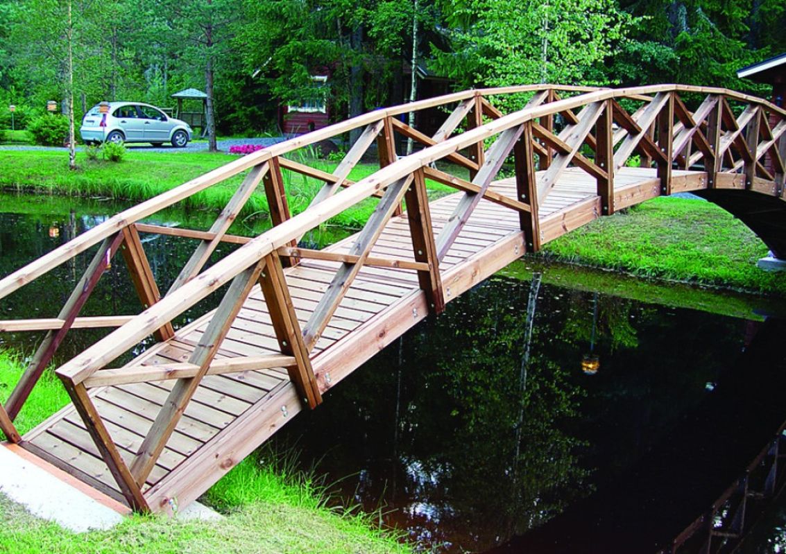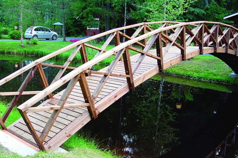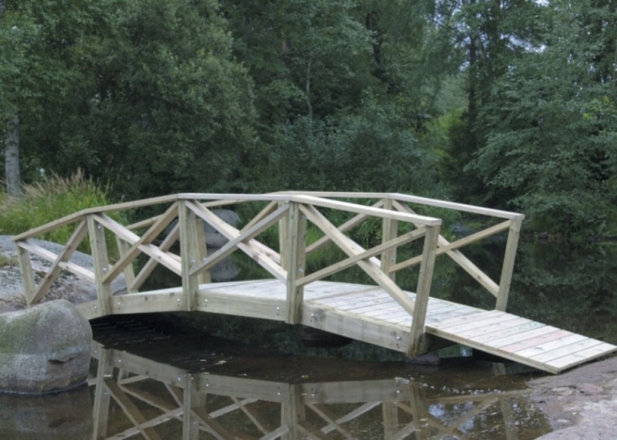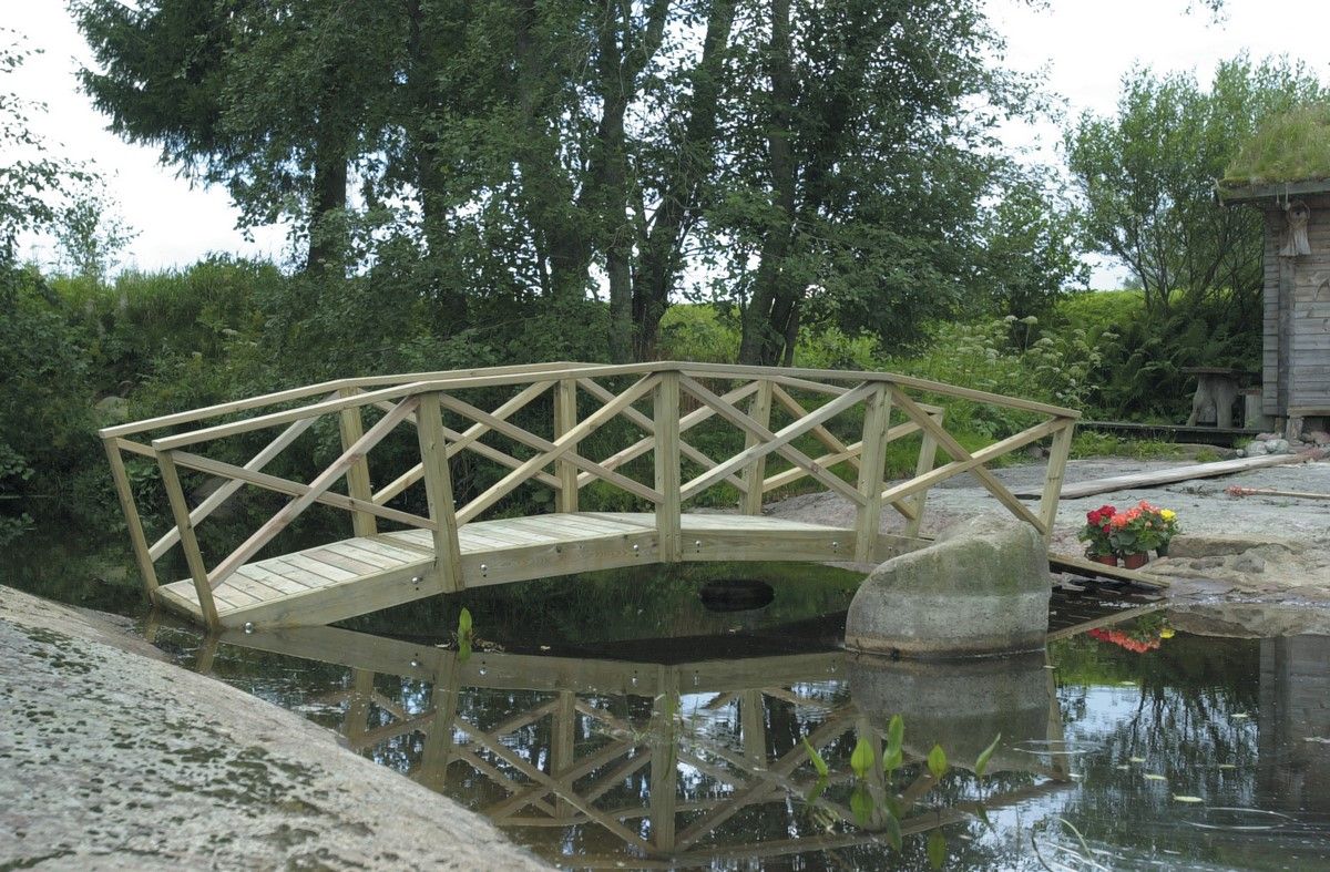 Kaarisiltaelementeistä voidaan rakentaa jopa 8 m pitkiä siltoja puutarhan ja pihan vesiaiheiden osaksi. Rakentaessasi yli 4 metriä pitkiä siltoja, kysy tehtaaltamme ohjeita maatukien perustamisesta.